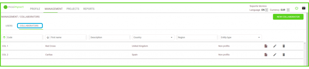 In this section you can register the partners with whom the initiatives are carried out: entities that participate in the development of the project or that benefit from it (NGOs, companies, administration, etc.).
