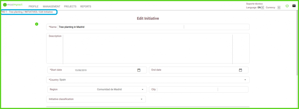 This fields establish when the initiative begins and ends. The end date can be left open if there is uncertainty regardind the end date.On the other hand, it must be taken into account that the star date of the initiative should be coherent with the date when the contributions are made. The date introduced corresponding to a contribution cannot be prior ro the start date of the initiative.