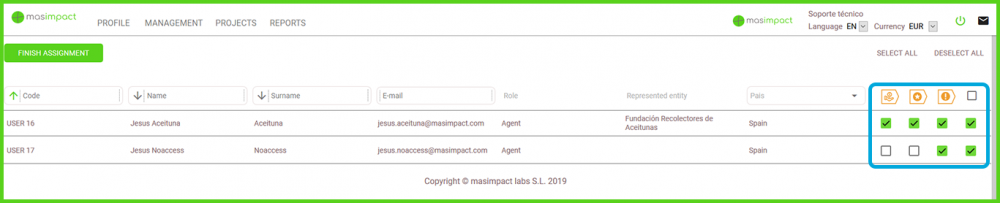 In the case of the initiative supervisor, the assignment to users can be assigned and removed by ticking the assignment box and selected users will have access to view and edit all the sections: contributions, outputs and impacts of the initiative.