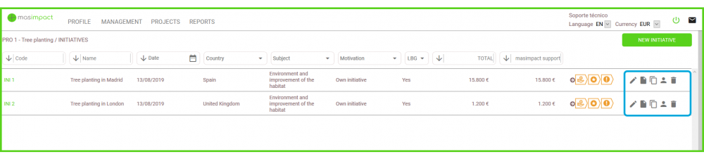 Duplicate Initiative: clicking on this icon will duplicate the information of the initiative in a new one, where the information of the duplicated initiative will be recovered with the possibility of over-editing the information that is necessary. The duplicate initiative will have a different code