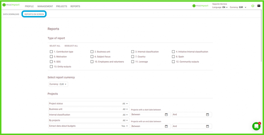 In these reports, preset by the masimpacr platform, you can select from the 12/13 reports offered by the platform. You can generate one, several, or all reports.