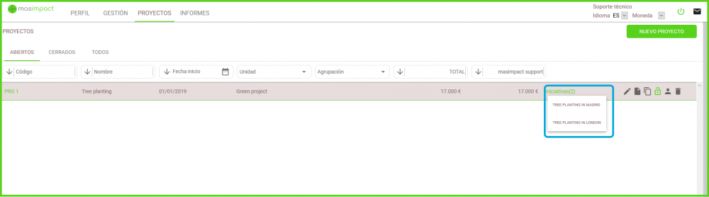 En este apartado podrá gestionar las iniciativas asociadas a un proyecto en particular