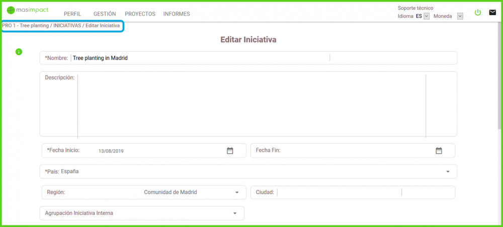 En este apartado se definirá cual es la iniciativa, es decir en qué consiste la actividad que se lleva a cabo. En el apartado de descripción se pueden detallar los objetivos concretos a cumplir. Cada Iniciativa, igual que los proyectos, tiene un código único. Cuando se elimina una iniciativa, el código se elimina igualmente y las siguientes iniciativas que se creen adoptarán los códigos sucesivos.