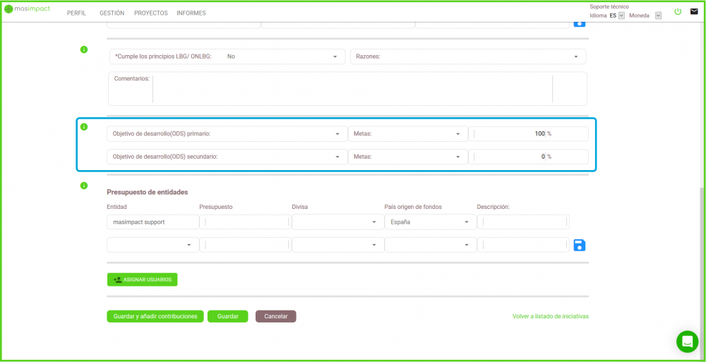 Si la iniciativa contribuye a más de un objetivo y meta, se podrá identificar un segundo objetivo y establecer el "peso" en forma de porcentaje que supone cada uno. La suma de los porcentajes de los objetivos debe ser 100%