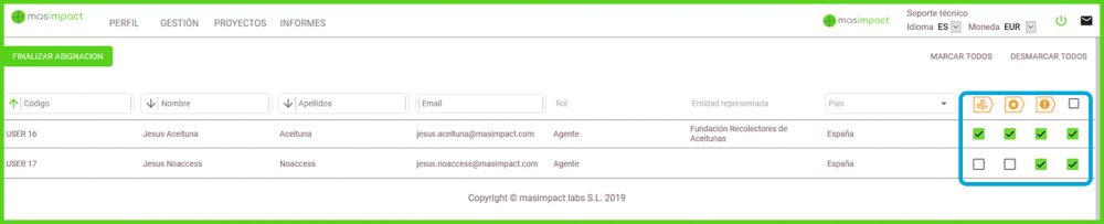 En el caso del supervisor de iniciativa, se puede asignar y quitar la asignación a los usuarios marcando el tic en la casilla de asignación y los usuarios seleccionados tendrán accesos para ver y editar todos los apartados: contribuciones, logros e impactos, de la iniciativa.