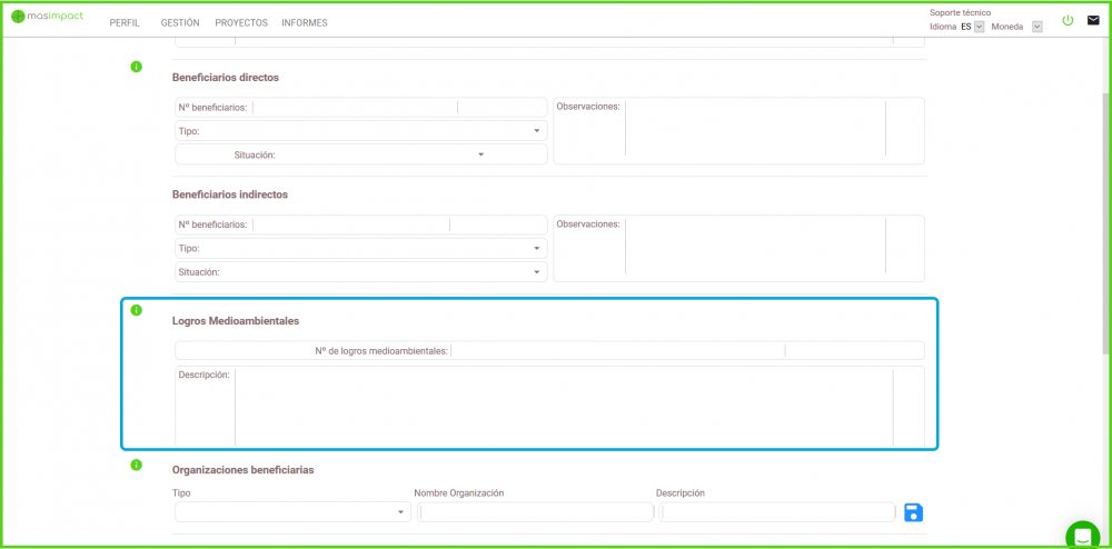 Los Logros medioambientales se refieren a las mejoras que podrían darse en beneficio del medioambiente como consecuencia de la iniciativa, representados por datos cuantificables: árboles plantados, toneladas de CO2 ahorradas, animales salvados, especies protegidas, toneladas de basura reciclada, etc.