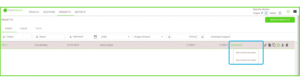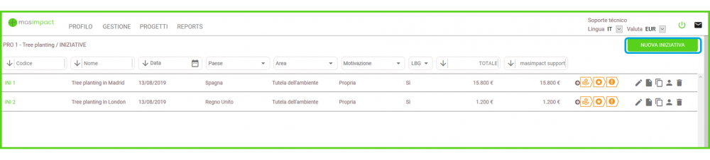 Questa sezione consente di gestire le iniziative associate a un progetto specifico.