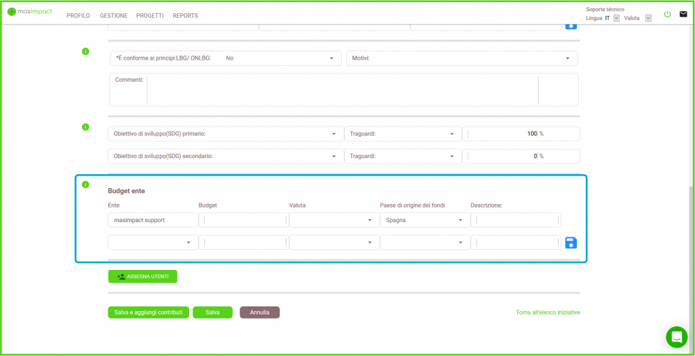 La sezione consente di inserire il Budget assegnato all’iniziativa, specificando il paese di origine dei fondi. Per Budget si intende l’insieme di risorse predeterminate (comprese eventuali donazioni in natura, tempo, monetarie, ecc.) che l’Ente prevede di utilizzare per la realizzazione dell’attività.