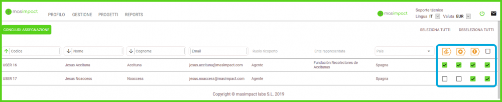 Nel caso del Supervisore dell’iniziativa, è possibile attivare l'assegnazione (o rimuoverla qualora sia attiva) marcando l’apposita casella con il segno di spunta. Gli utenti selezionati potranno visualizzare o modificare tutte le informazioni inserite nelle sottosezioni: Contributi, Risultati e Impatti dell’Iniziativa.