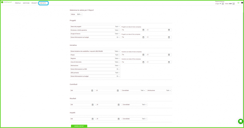 Attualmente lo strumento consente di generare due tipi di report. Scarica Excel Rapporti sullo schermo Entrambi hanno gli stessi filtri per personalizzare i report che è possibile estrarre dallo strumento di masimpact online.