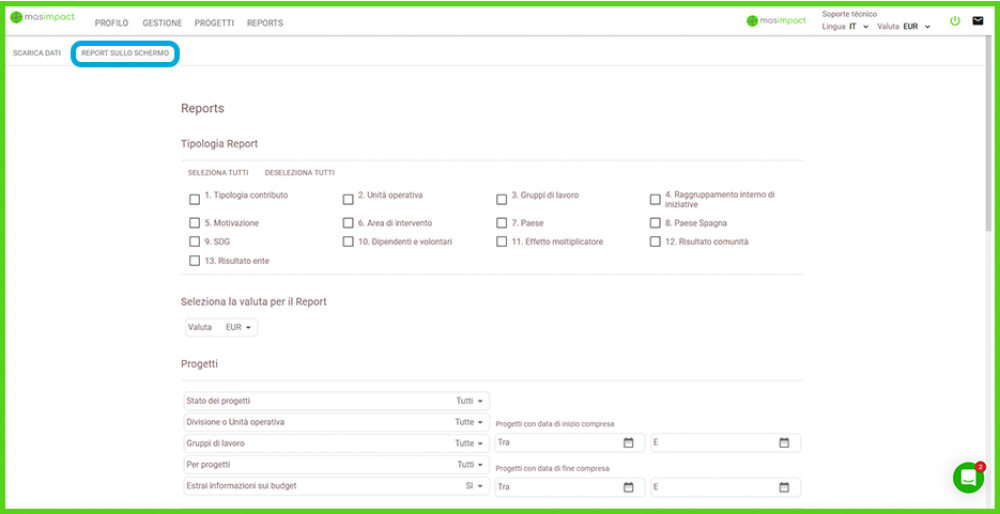 In questi report, preimpostati dalla piattaforma masimpacr, è possibile selezionare tra i 12/13 report offerti dalla piattaforma. È possibile generare uno, più o tutti i report.