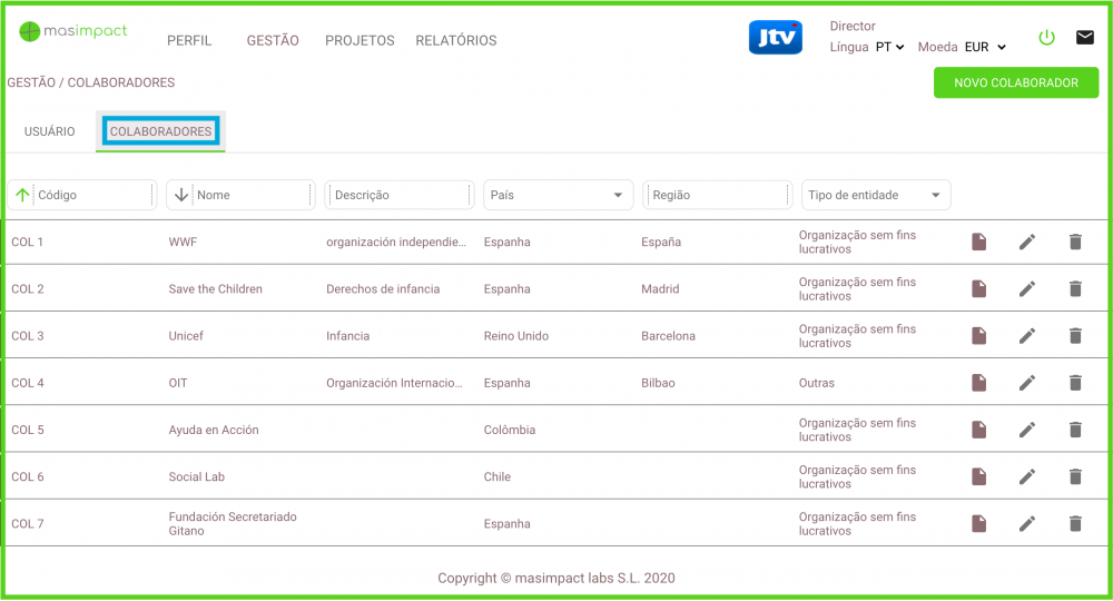 Nesta secção pode registar os parceiros com quem as iniciativas são levadas a cabo: entidades que participam no desenvolvimento do projecto ou que dele beneficiam (ONG, empresas, administração, etc.).
