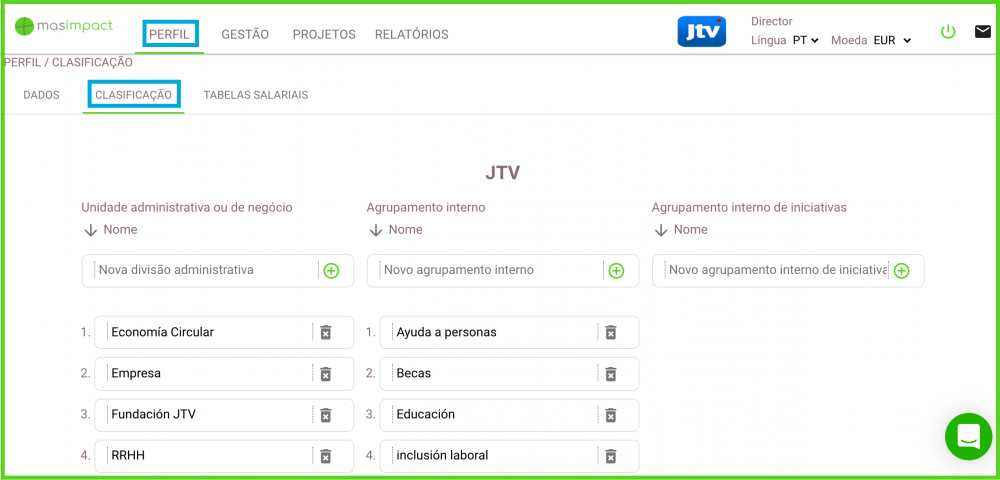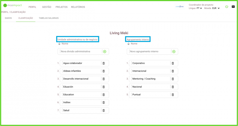 Na seção Perfil / Classificação, onde somente os usuários e gerentes responsáveis têm acesso, as divisões administrativas e/ou grupos internos podem ser criados. Estas divisões e agrupamentos internos podem ser vinculados aos projetos quando são criados.