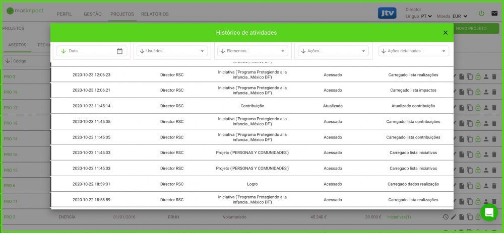 Se clicar sobre ele, poderá ver o histórico das atividades do usuário dentro daquele projeto/iniciativa. Ao indicar a data e a hora, o usuário, que elemento foi modificado e que ações foram realizadas.