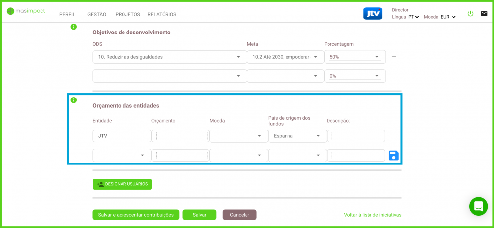 Pode indicar o orçamento da entidade e o orçamento dos colaboradores que participam na atividade. Para criar uma linha orçamentária adicional, clique no ícone salvar, à direita.