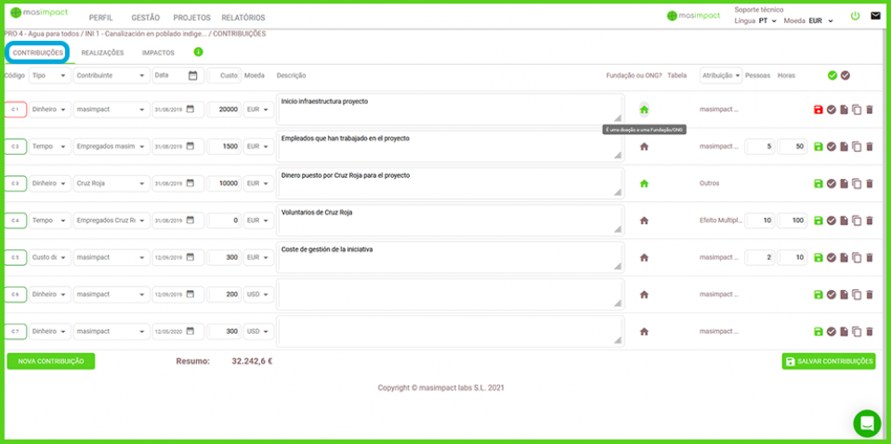 No caso da atividade ser realizada em tempo remunerado, este tempo terá um custo económico associado para a entidade que poderá ser indicado no campo de quantidade e moeda, além do número de pessoas e total de horas incorridas.