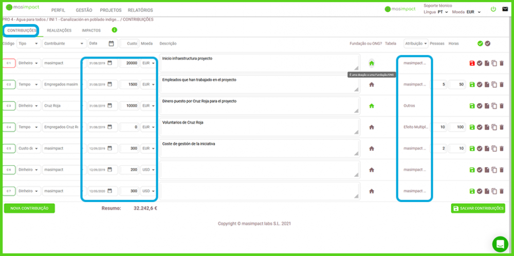 É necessário indicar em que data a contribuição foi feita e especificar a data de pagamento da contribuição a fim de realizar um cheque nas faturas e datas contábeis.Montante da contribuição: Quanto foi contribuído?