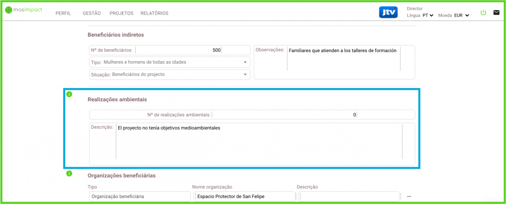 As Realizações Ambientais referem-se às melhorias que poderiam ser introduzidas no ambiente como resultado da iniciativa, representada por dados quantificáveis: árvores plantadas, toneladas de CO2 poupadas, animais poupados, espécies protegidas, toneladas de resíduos reciclados, etc.