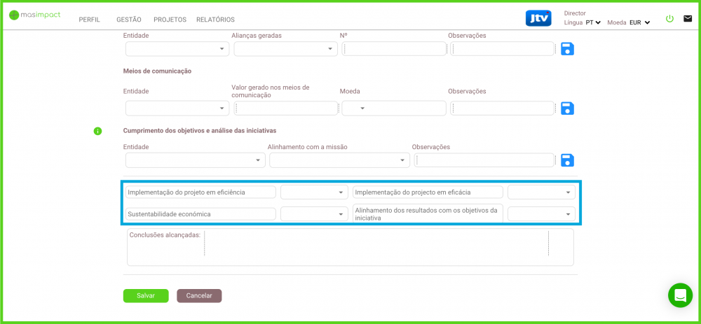 Esta secção pode indicar como os resultados alcançados estão alinhados com os objectivos e metas estabelecidos no início.A valorização alta ou baixa destes indicadores deve ser marcada pela entidade utilizadora, em função do tipo de actividade e da exigência exigida.
