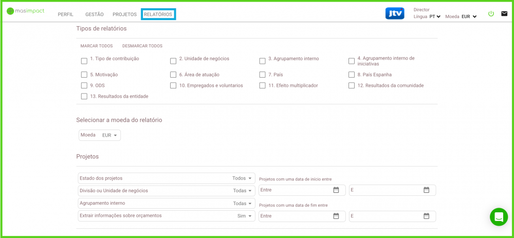 Atualmente, a ferramenta permite gerar dois tipos de relatórios. Descarregamento dos dados em excel Relatórios na tela Ambos têm os mesmos filtros para personalizar os relatórios que pode extrair da ferramenta online masimpact.